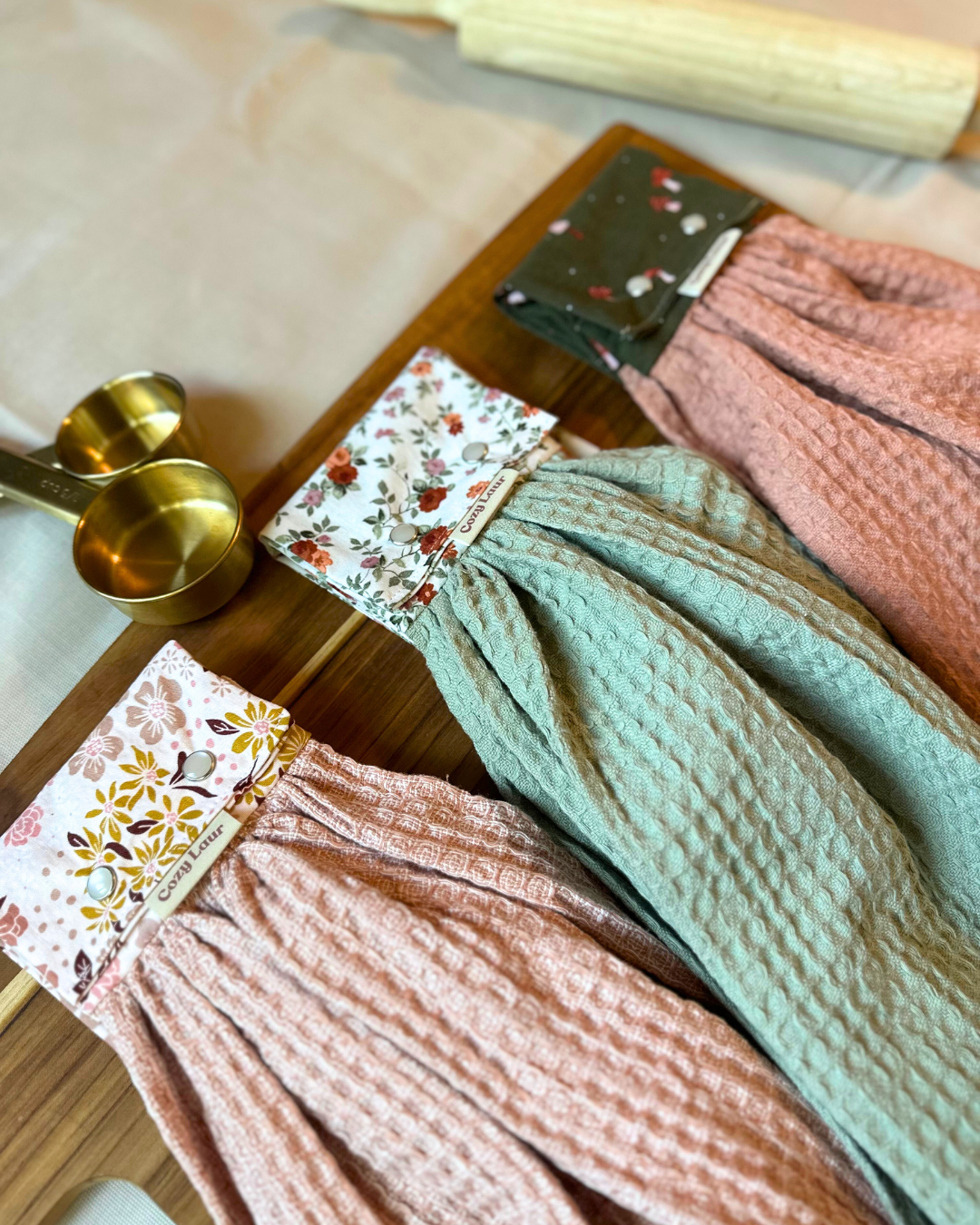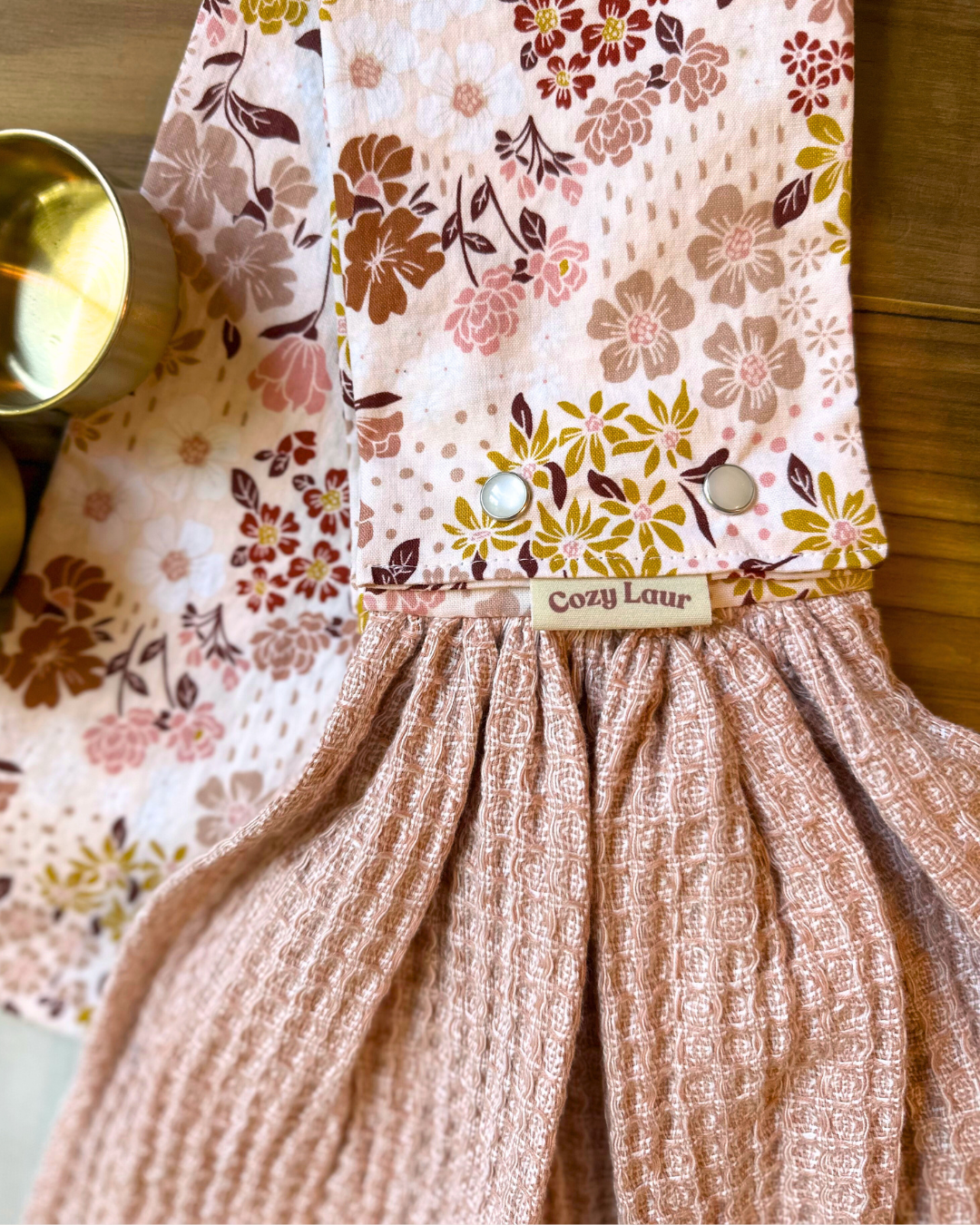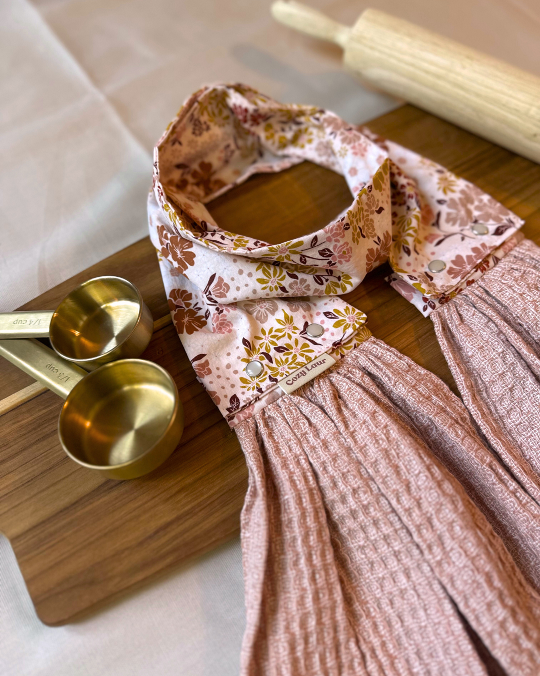 Handmade in our small home for your kitchen and beyond, this scarf features a beautiFALL floral strap with your favorite detachable waffle towels in peach.