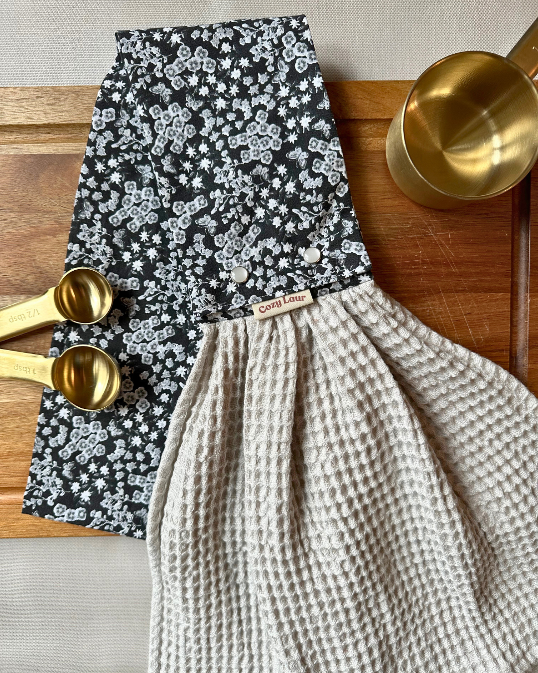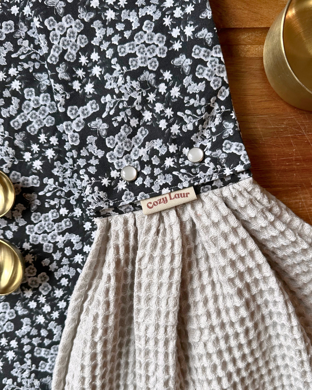 Handmade in our small home for your kitchen and beyond, this scarf features a black/gray floral design attached to two detachable gray waffle hand towels.