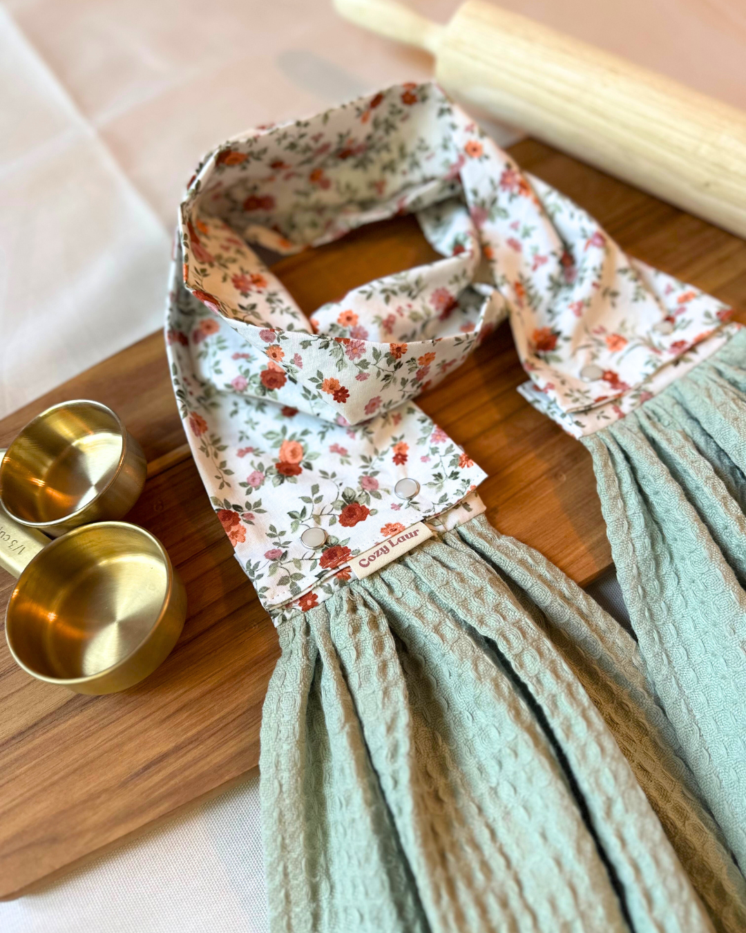 Handmade in our small home for your kitchen and beyond, this scarf features a strap befitting Jane Austen in the fall with your favorite detachable waffle towels in moss.