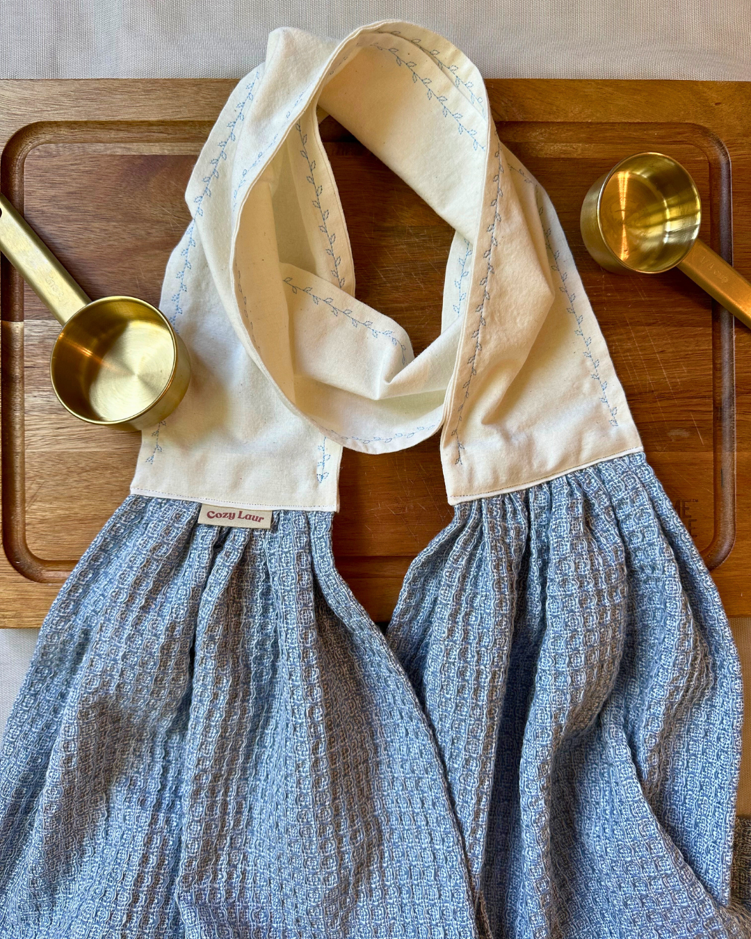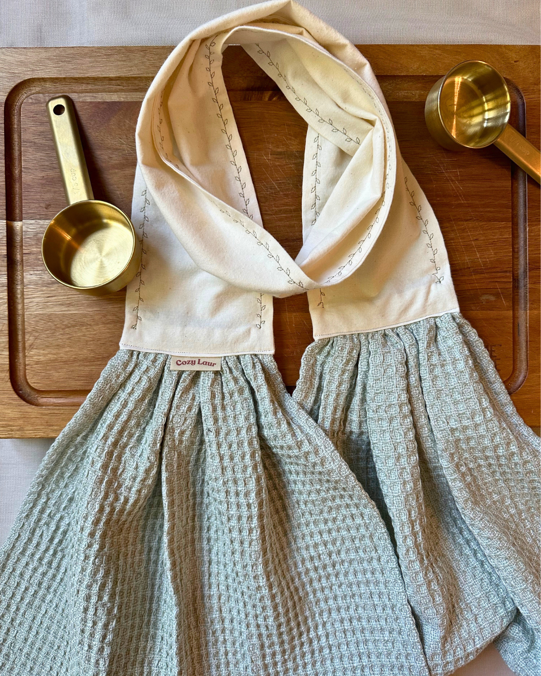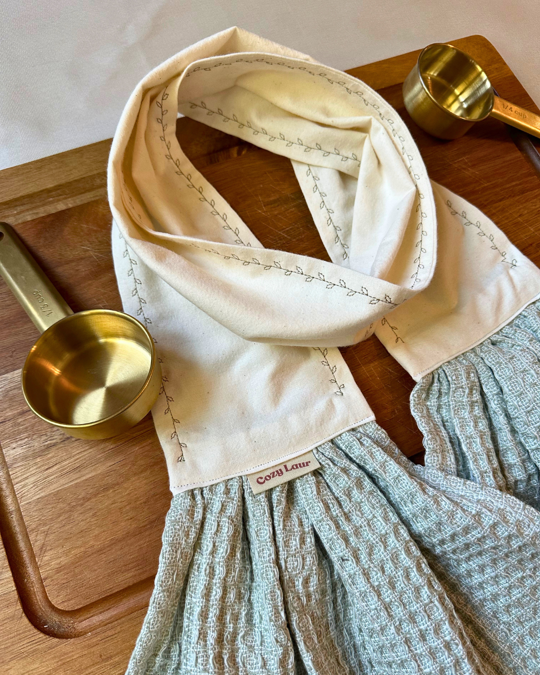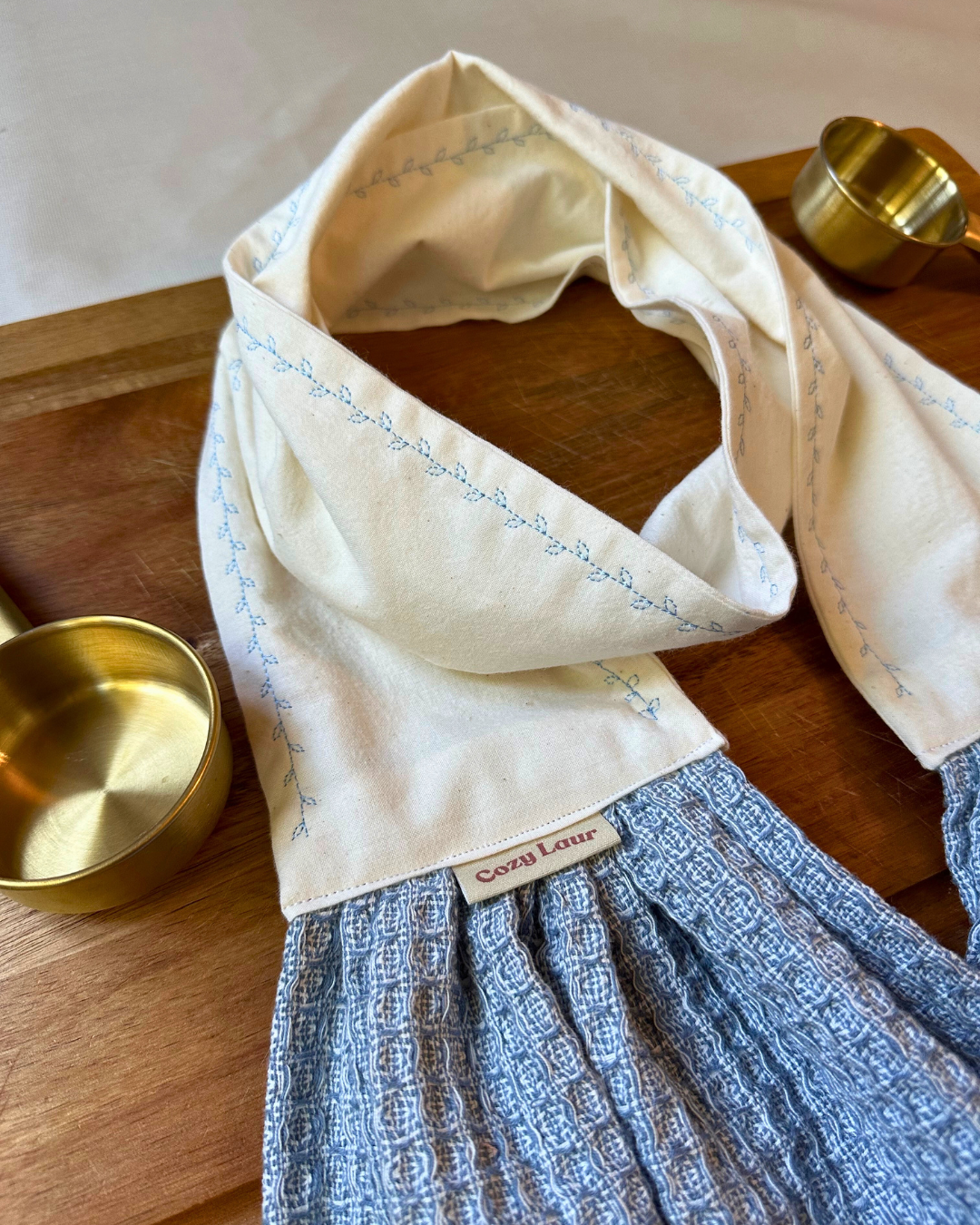 The Original Cozy Laur Towel Scarf features a farmhouse-inspired rustic white strap with an embroidered leaf border. Each end is attached to two waffle towels; now available in 3 colorways - cornflower blue, sage green, and peach.