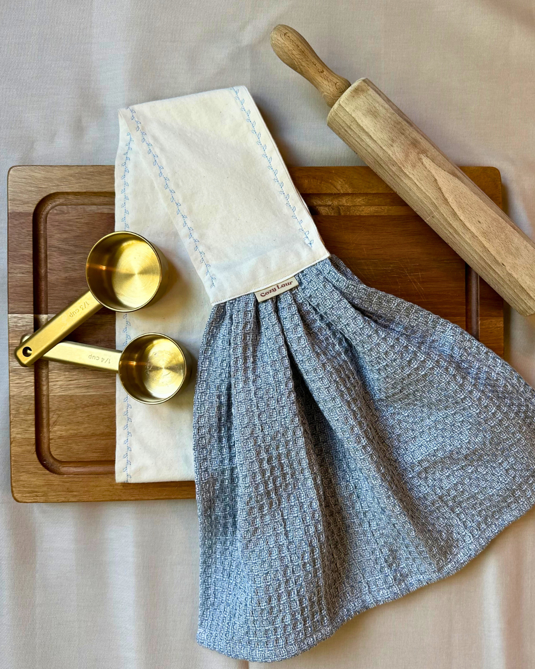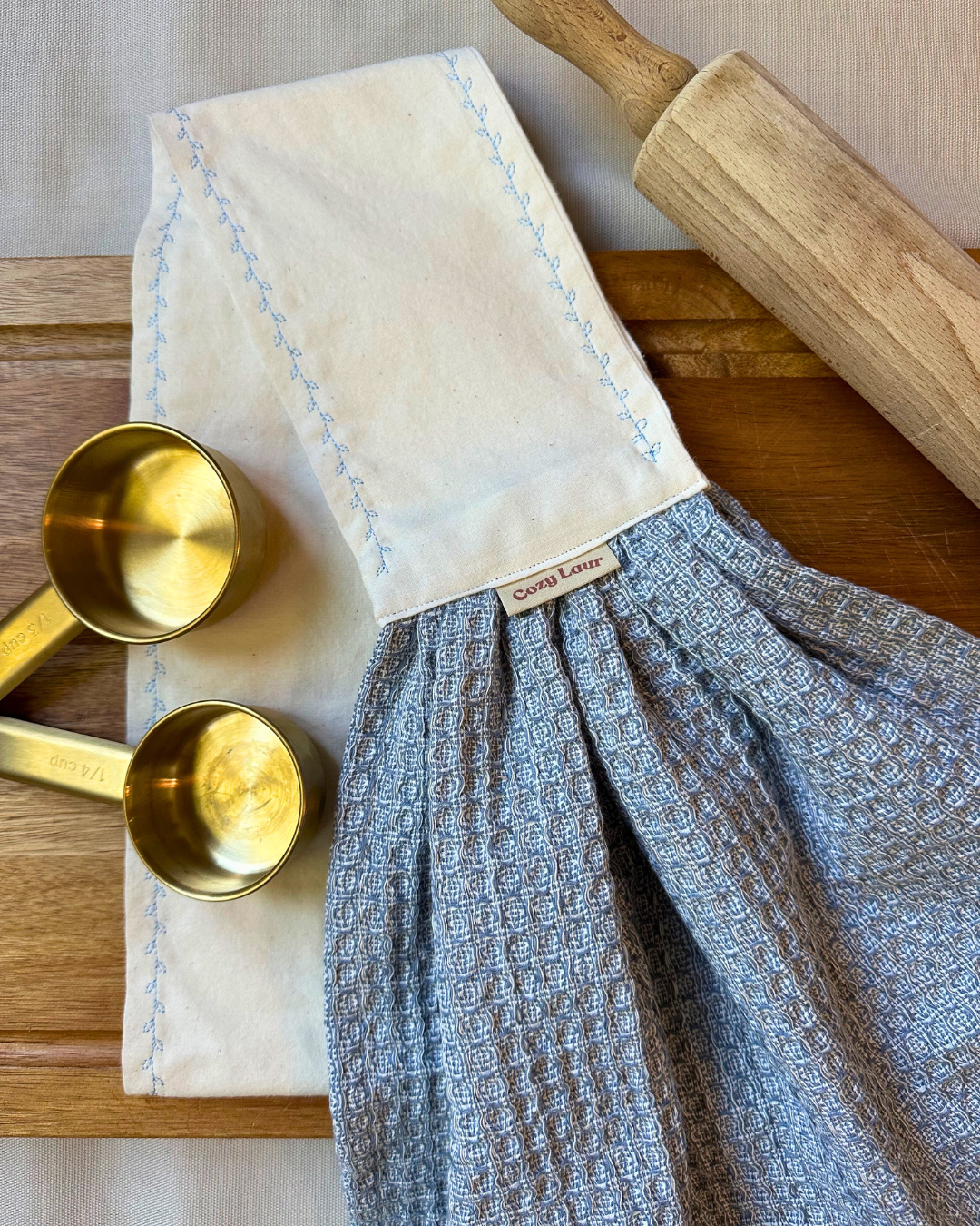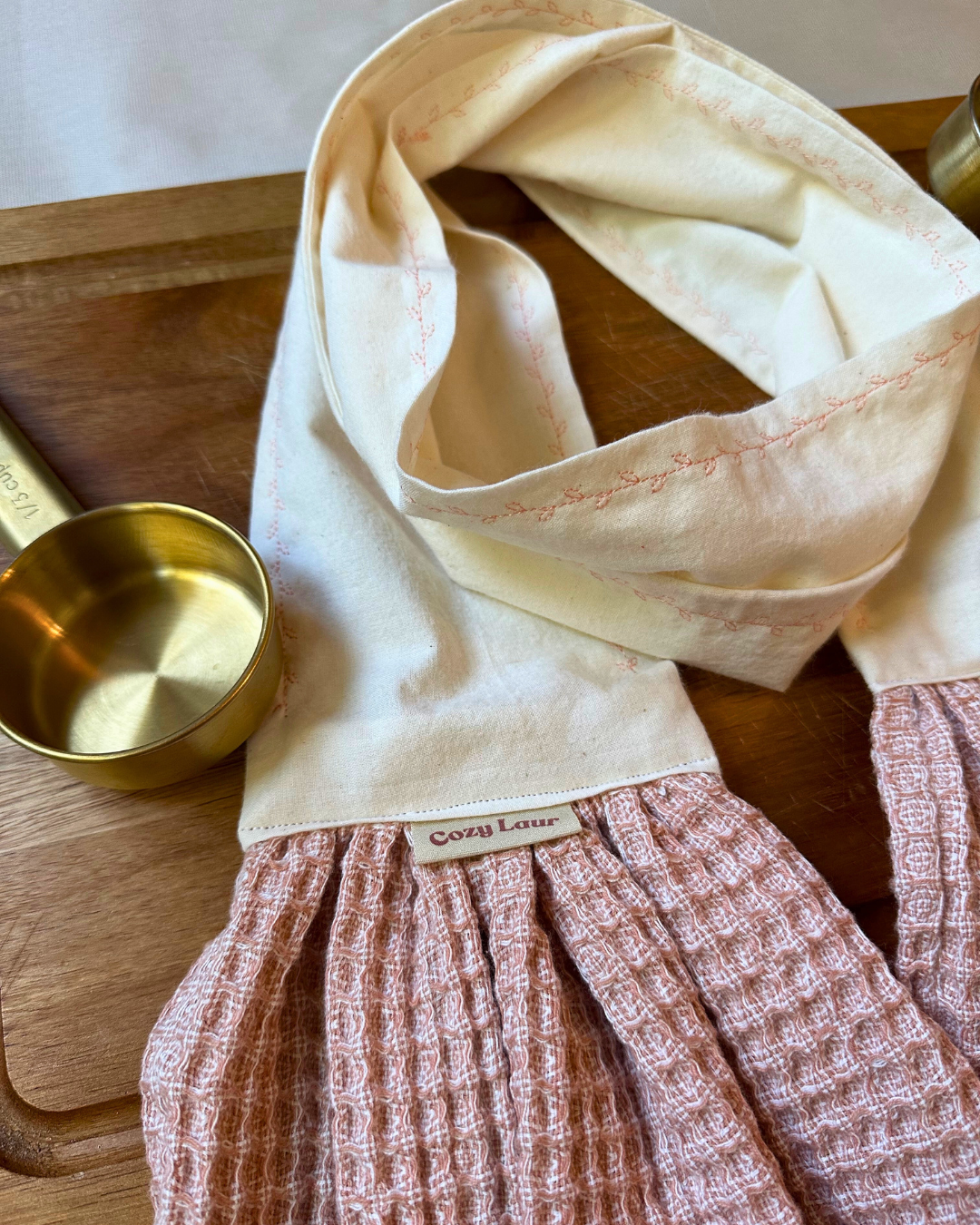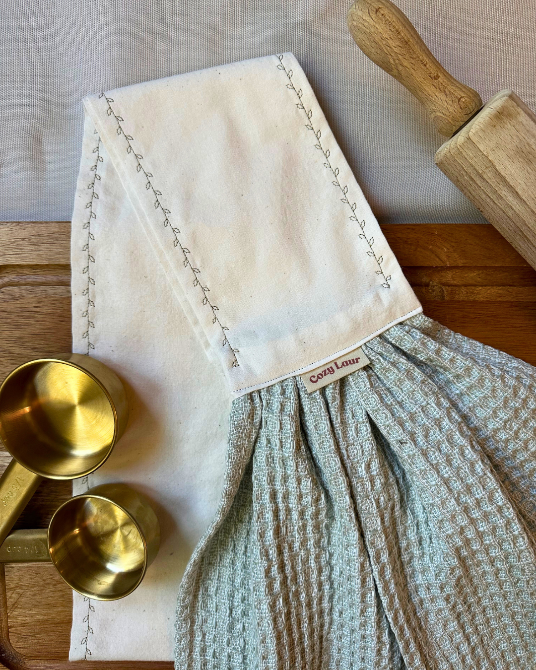 The Original Cozy Laur Towel Scarf features a farmhouse-inspired rustic white strap with an embroidered leaf border. Each end is attached to two waffle towels; now available in 3 colorways - cornflower blue, sage green, and peach.