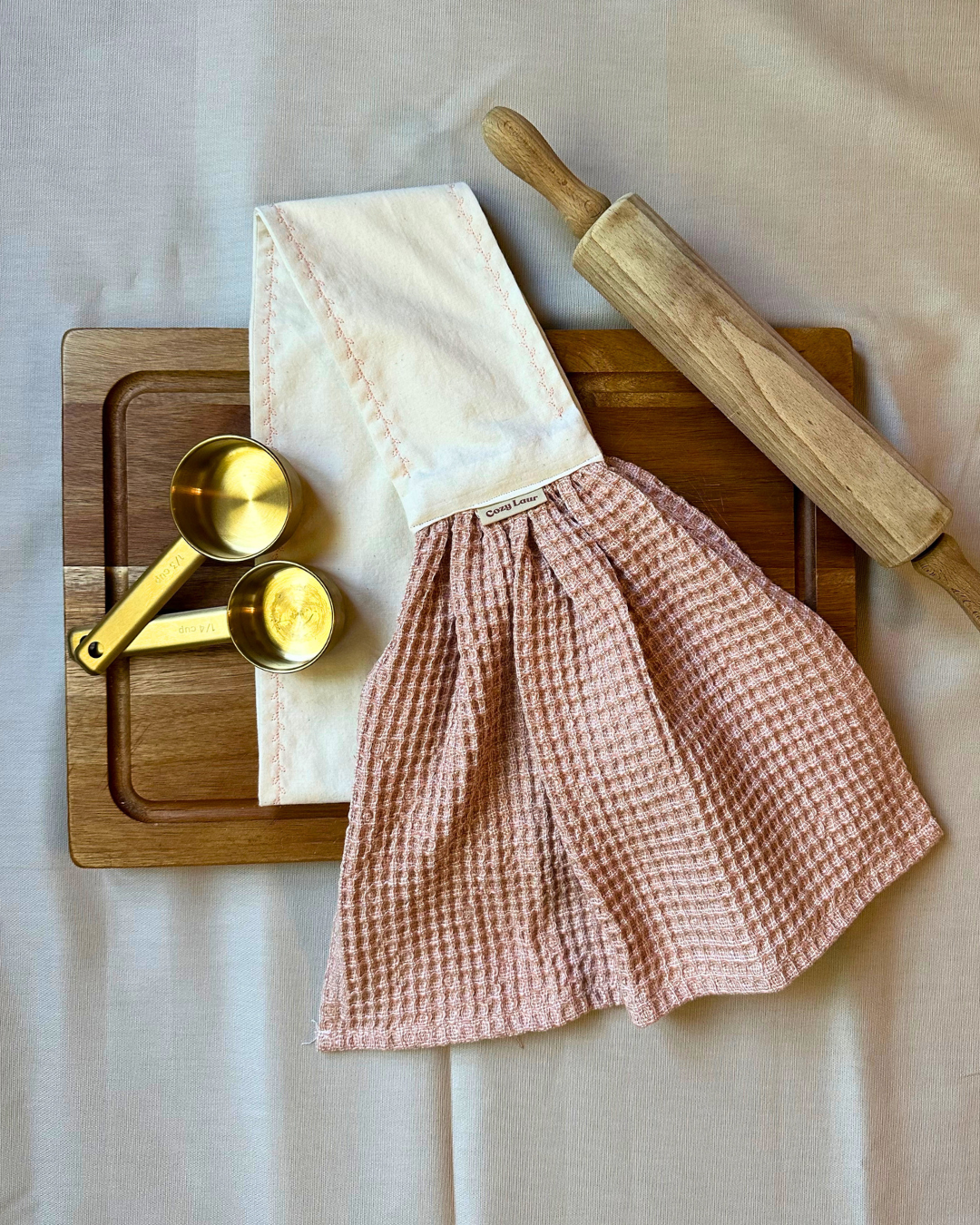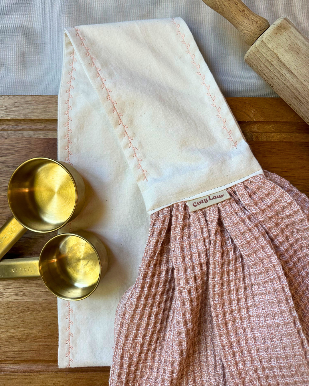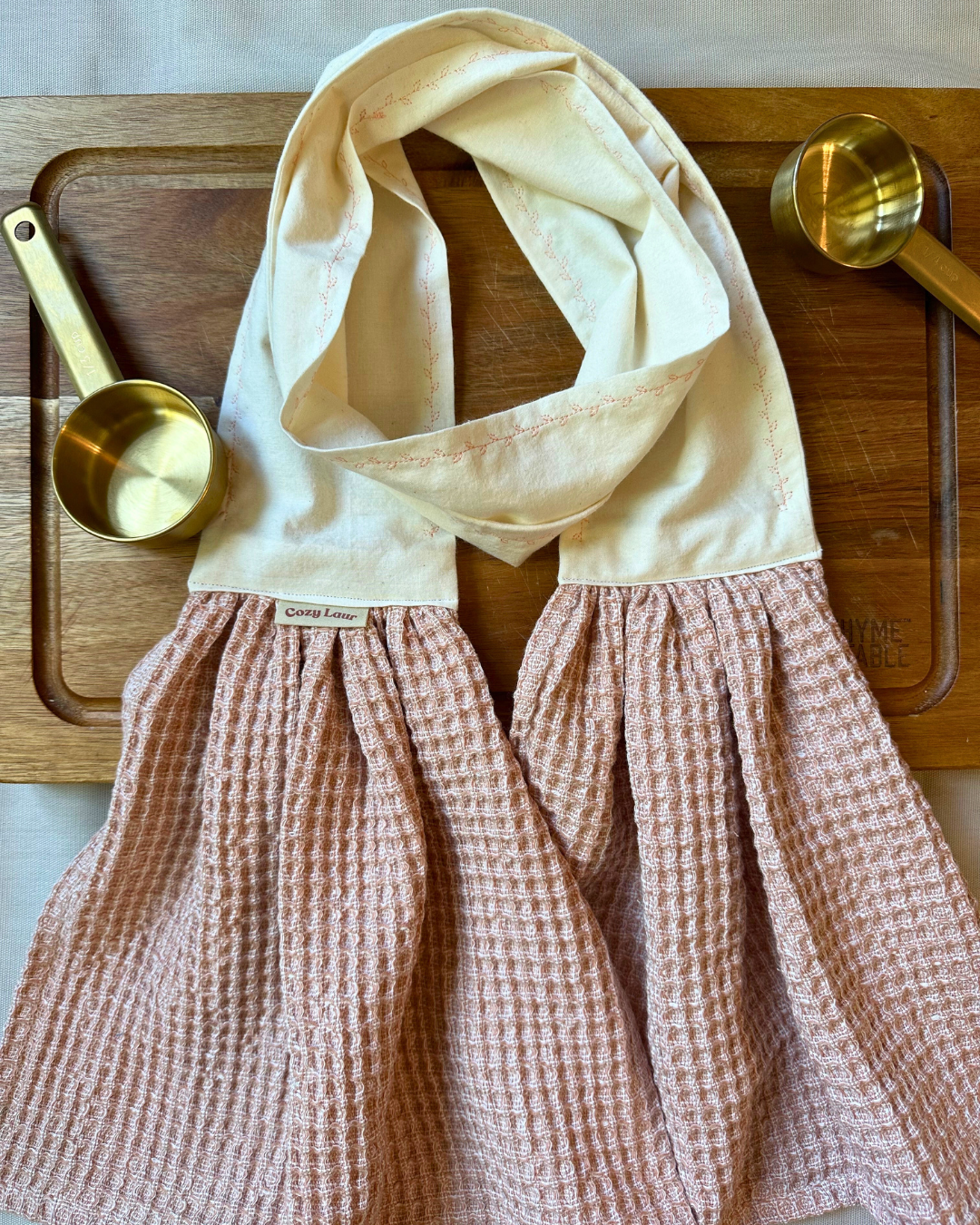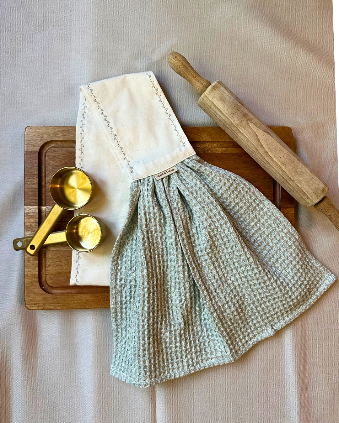 The Original Cozy Laur Towel Scarf features a farmhouse-inspired rustic white strap with an embroidered leaf border. Each end is attached to two waffle towels; now available in 3 colorways - cornflower blue, sage green, and peach.